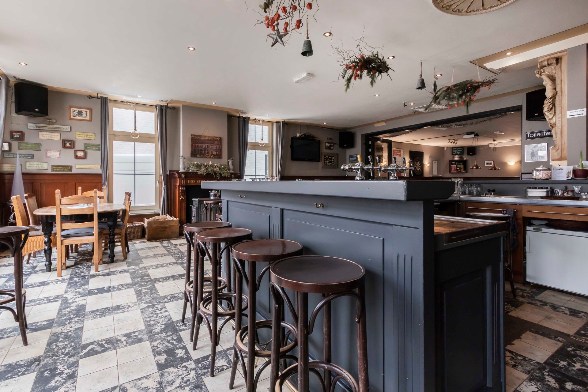 Impressie van de voorgevel en het oude interieur van Grand Café Het Stift in hartje Thorn.